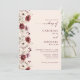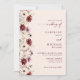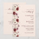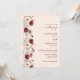 Invitación de boda con caligrafía elegante y guión de borgoña con diseño de flor silvestre, código QR y más información detallada en la parte posterior.
