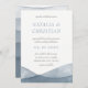 Borde de acuarela de tonos azules con tinte de inmersión, invitación de boda. Estilo de diseño simple y moderno con tipografía coordinada de azul polvoriento y gris. La parte trasera de la invitación presenta un patrón de acuarela azul sumergido coincidente.
