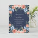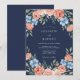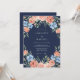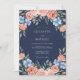 Este diseño presenta un encantador arco de suaves flores de melocotón y delicadas flores azules sobre un fondo profundo navy. El exuberante follaje enmarca la disposición, creando un ambiente elegante y romántico. La vibrante exhibición floral evoca un sentido de belleza clásica.