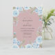 Flores delicadas de color azul celeste y suaves verdes crean un borde mágico. Este diseño crea una atmósfera romántica y soñadora, perfecta para una boda en primavera o verano. El fondo rosado tenue resalta la belleza floral.