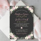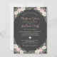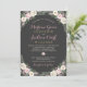 Esta invitación de boda presenta un fondo de carbón profundo enmarcado con flores rosadas e ivories románticas y un suave follaje. Nombres de guion elegantes combinados con tipografía serif limpia crean un aspecto moderno-romántico que se siente perfecto para las celebraciones de otoño e invierno. Ideal para parejas que quieren flores oscuras con tipo atemporal. Invitación de boda.