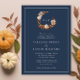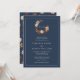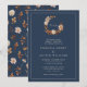 Esta elegante y moderna invitación de boda cuenta con una corona de hojas de terracota y naranja quemada pintadas a mano con acuarela, dahlias crema y beige, y hermosas rosas de color óxido sobre un fondo de color azul marino con el monograma de la novia y el novio. Encuentre artículos coincidentes en la colección Navy Autumn Romance.