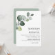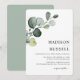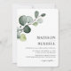 Sencilla y elegante vegetación de eucalipto con salpicaduras de oro para invitación de boda. Tipografía clásica y manuscrita con alineación a la derecha. Agrega el nombre de la novia y el novio en la parte posterior. Artículos coincidentes en esta colección.