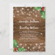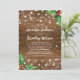 Invitaciones de boda de Navidad de campo rústicas con fondo de madera oscura, acebo festivo, copos de nieve y luces titilantes.
