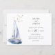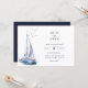 Invitación de boda con tema náutico de yate acuarela. Coordinando el respaldo de color azul marino oscuro. La invitación presenta un estilo de diseño de tipografía chic mezcla de caligrafía y tipo negrita.