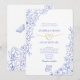 Lleva el romance atemporal a tu día de boda con esta elegante invitación blanca y azul inspirada en el Chinoiserie. Un delicado arte lineal floral azul rodea el borde, complementado con finos bocetos de mariposas y un corazón de cuerda dorada único que simboliza la unidad y el amor eterno. La disposición refinada y la tipografía serif limpia añaden un toque de sofisticación, perfecto para bodas clásicas, de jardín o de estilo europeo. Personaliza con los detalles de tu ceremonia y crea un recuerdo memorable que combina la tradición y el encanto. Incluye diseño floral trasero coordinado.