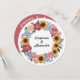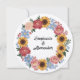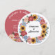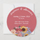 Esta hermosa invitación de boda es muy rústica y boho. Una corona floral rodea los nombres de los cónyuges en la parte delantera y está compuesta por girasoles, tiernas peonías y myosotis «no me olvides». En la parte trasera, el color de las peonías se utiliza como fondo para todos los textos personalizables. ¡Para una boda feliz, delicada y simple con florituras!