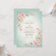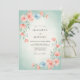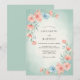 Este diseño romántico presenta una delicada cascada de coral en acuarela y flores azules suaves con follaje colgante. El fondo luminoso y aireado evoca una sensación de elegante delicadeza. Toques de rosa suave añaden profundidad a la disposición floral.