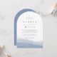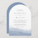 Elegante invitación a bodas costeras con gradientes de color azul claro a lo largo del fondo con una elegante curva que evoca el flujo y el flujo del mar. Los detalles de su boda aparecen en letras grises clásicas minimalistas con nombres en negrita.