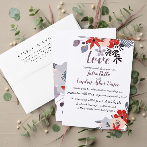 Invitaciones a la boda de Flores Silvestres Rosadas y Verdes de la Marina Ultra Violeta. Patrón Floral Vintage de color de agua.