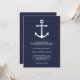 Moderna suite de invitaciones a bodas de la Marina Náutica azul Anchor azul: Invitación a la boda con ancla blanca con detalles bodas en sans modernos blancos tipo serif sobre fondo azul marino. Perfecto para bodas náuticos, boda con temática playera y más.