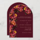 Una invitación a la boda en forma de arco. Para un boda elegante y romántico. Un fondo burdeos adornado con flores de color burdeos, rosa y melocotón. Personalice y agregue sus nombres y detalles.