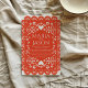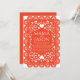 El diseño de esta invitación a la boda de arte folclórico Naranja Papel de México presenta un marco naranja simétrico y decorativo inspirado en los patrones tradicionales de papel picado o corte de encaje, a menudo vistos en ambientes de arte festivo o folclórico. Intrincados motivos blancos recortados de corazones, flores y remolinos adornan la frontera, creando un ambiente elegante y romántico. Los bordes de las vieiras están adornados con formas punteadas y petales repetidas, lo que hace que el diseño sea perfecto para invitaciones, tarjetas de felicitación o invitaciones festivas con un encanto artesanal.