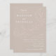 Invitaciones botánicas de boda con sus nombres y detalles bodas con letras blancas divididas por una vid de hojas esbozadas con un fondo de taupe. Las elegantes invitaciones nupciales se coordinan con nuestra colección de bodas de Cascading Leaves.