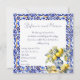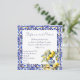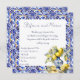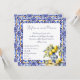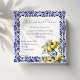 Amalfi Positano Vietri azulejos azul Majólica limones boda plantilla editable invitación descarga digital instantánea, baldosas azul y amarillo con temática mediterránea con ramo de cítricos con limones y flores en jarrón de cerámica azul tarjetas de invitación a la boda