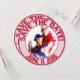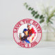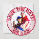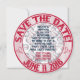 Boda de Béisbol Themed-Round Save the date cards. Este se personaliza para un cliente específico. La parte delantera de la tarjeta es un fotograma/inserción. Anillos interiores y exteriores rojos con una foto personalizada en el centro. Los círculos decorativos de vidrio rojo alrededor de la parte superior y dicen: Reserva la fecha. Más círculos de texto de vidrio alrededor de la parte inferior y lee la fecha Boda de los clientes. Este texto está a ambos lados de la tarjeta. El fondo de la llanta externa son las rayas de béisbol rojas y blancas. En el reverso de la tarjeta, tienes el mismo texto en la parte superior e inferior sobre un fondo rayado. Los adornos del corazón se sientan entre las palabras. El fondo central es de color blanco macizo, con unas bóvedas diseminadas por todas partes. El texto de vidrio decorativo dice: ÉL y ELLA (sus nombres) se están acercando al plato y batean 1000 que su amor durará para siempre. Los equipos se fusionarán en uno...Las invitaciones temáticas de los bodas de béisbol están disponibles en varios patrones de mezcla y partidos. Estas invitaciones incluyen también los sobres.