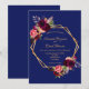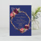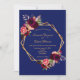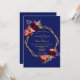 En el frente: fondo azul oscuro con un marco geométrico falso dorado. Decorada con flores oscuras de color burdeos y rosa, rosas y plumas de estilo boho. Plantillas para sus nombres y detalles del boda. Los nombres están escritos con una escritura de estilo moderno con letras a mano, letras azules Back: fondo azul marino.