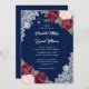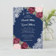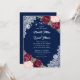 Personalizado rústico de color azul marino, borgoña y rubor invitación a la boda con rosas y aliento de bebé contra un fondo de burlap y encaje decorado con luces de cuerda. Los detalles de los bodas se escriben en un estilo de escritura moderno y elegante.
