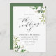 Elegantes invitaciones bodas botánicas con follaje acuático en tonos primavera y verde musgo en las esquinas del diseño. La frase "El Boda de" se muestra en un guión de caligrafía de moda. Personalice la invitación a bodas de boho con los nombres de los bodas. La moderna invitación botánica a las bodas es perfecta para bodas de primavera y verano.