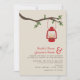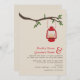 Invitación a bodas al aire libre con temática de naturaleza salvaje/camping que incluye el ilustracion de una lámpara de aceite roja colgando de una rama de árbol con hojas verdes. Personalice el texto con su información.