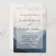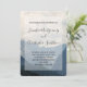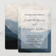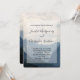 Una invitación de boda con una fotografía de hermosas montañas, un cielo nublado y colinas onduladas llenas de árboles en primer plano. Esquema de color azul gris.