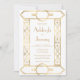Esta elegante invitación de bodas de inspiración vintage presenta un texto de color dorado sobre un fondo blanco, enmarcado por un elegante borde Art Déco geométrico vintage en un falso Relieve metalizado de oro. El reverso proporciona espacio para los detalles del boda sobre un fondo blanco sólido, junto con un código QR que los huéspedes pueden explorar para visitar su sitio web y RSVP, lo que ahorra el coste de imprimir y enviar por correo tarjetas RSVP separadas.
