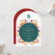 Celebre su boda de otoño con esta invitación estilo boho que presenta un círculo verde azulado audaz, hojas de cascada y tipografía elegante. El corazón de las cuerdas doradas añade un romántico encanto rústico, mientras que la parte trasera incluye un código QR para la RSVP. Una elección elegante para parejas modernas que planean una celebración de temporada.