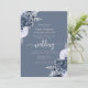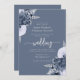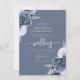 Esta elegante invitación a la boda se caracteriza por sus ramos florales de color azul y polvorientos y su vegetación de Relieve metalizado de imitación plateada en dos esquinas, sobre un polvoriento fondo azul. El texto del personalizable combina serif de color gris plateado, cursiva y letra manuscrita. El reverso proporciona espacio para los detalles del boda sobre un fondo azul polvoriento sólido, junto con un código QR que los huéspedes pueden explorar para visitar su sitio web y RSVP, lo que ahorra el coste de imprimir y enviar tarjetas RSVP separadas.