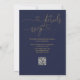 Esta elegante invitación de boda azul marino y dorado con caligrafía de escritura cardíaca puede ser personalizada con su información en tipografía de moda con los detalles de su sitio web boda y su código QR al revés. Diseñado por Thisisnotme©