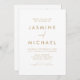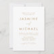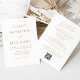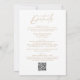 Invitaciones a bodas todo en uno simples y elegantes con un guión dorado y manuscrito mezclado con letras modernas en un fondo blanco. Personalice la parte delantera de la invitación a la boda minimalista con su nombre y detalles de boda. Personalice la parte posterior de la invitación con detalles del boda, como información de recepción, alojamiento de hotel, instrucciones RSVP y sitio web del boda. Agregue el enlace deseado del sitio web del boda a la plantilla de código QR proporcionada para que sus huéspedes puedan ver fácilmente RSVP en línea y obtener información adicional sobre el boda. Las invitaciones de boda "todo en uno" son la elección perfecta para los bodas modernos.