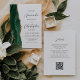 El borde izquierdo de esta elegante y moderna invitación a la boda incluye una acuarela de color verde esmeralda bordeada por un falso purpurina de oro. El texto de personalizable combina secuencias de comandos de color gris carbón y sans serif en un fondo blanco. El lado inverso proporciona espacio para los detalles del boda, junto con un código QR que los huéspedes pueden explorar para visitar su sitio web y RSVP, lo que ahorra el costo de imprimir y enviar tarjetas RSVP separadas.