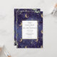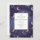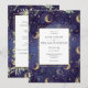 Una hermosa invitación de boda celestial que presenta oro, lunas y estrellas con un fondo azul de medianoche, tipografía elegante moderna y detalles de RSVP y código QR del sitio web de la boda en el reverso. Diseñado por Thisisnotme©