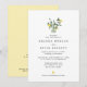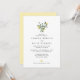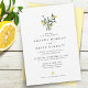 Invitación de boda de limones al acuarela simples y elegantes con vegetación en un arreglo de frasco con fuente clásica debajo. En el reverso de la invitación hay un código QR para responder.
