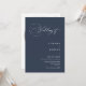 Esta elegante invitación a la boda presenta un diseño refinado con un texto romántico en forma de arco que incluye las palabras "Boda de" elegantemente escritas en la parte superior, añadiendo un toque formal e intemporal a un fondo azul marino. Combinada con una tipografía serif limpia y un guión escrito a mano moderno, esta invitación minimalista es perfecta para parejas que buscan un equilibrio entre sofisticación y simplicidad. El diseño también incluye espacio para una foto de la pareja y un código QR en la parte posterior para opciones sin fisuras de RSVP. Intenta ponerte verde con esta moderna invitación ecológica en directo reduciendo el número de tarjetas de detalles y de confirmación. Simplemente agregue tu propio código QR al reverso de la invitación para que tus invitados se presenten a RSVP y descubra más información sobre tu boda. Personalizar los nombres y la redacción en unos pocos pasos fáciles, y personaliza la tarjeta de invitación con tu foto de la pareja feliz para darle un toque único y personal. Nota: El texto de forma circular geométrica de "Por favor únase a nosotros para el" junto con la elegante y bella tipografía de "Boda de" en la parte delantera de la invitación Y la frase "conteste amablemente" en la parte posterior de la invitación junto con otros elementos de arte gráfico como las líneas no pueden editarse, cambiarse, moverse ni eliminarse. Están arreglados. Si necesita cambiar el color, puede personalizar la tarjeta de invitación. Puede personalizar fácilmente esta invitación con su propio texto y compartirla digitalmente a través de texto, correo electrónico o medios sociales. Como alternativa, puede enviar una versión impresa a sus invitados o hacer ambas cosas: enviar una versión digital y realizar el seguimiento con una copia impresa para una experiencia más personalizada.