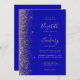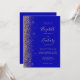 El borde izquierdo de esta elegante y moderna invitación a la boda tiene un diseño purpurina de imitación dorada. El texto del personalizable combina la escritura a mano de color dorado pálido, el copperplate y las tipografías cursivas sobre un fondo azul real. El reverso proporciona espacio para los detalles del boda sobre un fondo azul real sólido, junto con un código QR que los huéspedes pueden explorar para visitar su sitio web y RSVP, lo que ahorra el coste de imprimir y enviar tarjetas RSVP separadas.