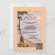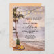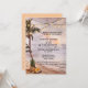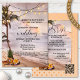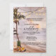 Una romántica invitación a la boda con una playa tropical al atardecer con luces de cuerda en las palmeras y una piña con flores. En la parte posterior hay una plantilla de código QR (opcional). Hermoso para una boda de destino.