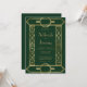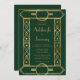 Esta elegante invitación a la boda, de inspiración vintage, presenta un texto de color dorado sobre un fondo verde esmeralda oscuro, enmarcado por un elegante marco geométrico art deco en un falso Relieve metalizado de oro. El reverso proporciona espacio para los detalles del boda sobre un fondo verde sólido, junto con un código QR que los huéspedes pueden explorar para visitar su sitio web y RSVP, lo que ahorra el coste de imprimir y enviar por correo tarjetas RSVP separadas.
