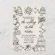 Esbozos Quirky De Inspiración Vintage, Dibujados A Mano, Whimsical Wedding Invitation. Perfecto para las parejas que buscan un toque creativo y alegre con un toque nostálgico, este diseño lúdico presenta un fondo blanco roto o envejecido, lo que le da un toque de época. La disposición dinámica de los grandes ilustraciones hechos a mano desborda los bordes, creando un aspecto artístico y moderno con un toque de encanto de antaño. El diseño incluye extractos caprichosos de elementos bodas como una brillante bola de disco, campanas bodas, una cámara vintage, una torre de champán, corazones, un pastel en niveles, flores y un auto "Just Married". Estos doodles extravagantes añaden un ambiente animado y despreocupado mientras mantienen una estética elegante y sofisticada. Los detalles de su boda se resaltan en una mezcla de guiones y tipos de letra manuscritos, complementando perfectamente el tema vintage pero lúdico. Personalizable completo, puede ajustar colores, texto y disposición para que se adapte a su visión. Ya sea impresa o compartida digitalmente, esta invitación única es una manera memorable de anunciar su día especial.