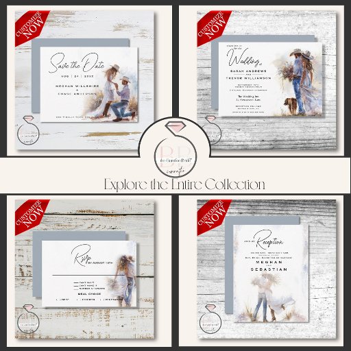 Relájese para un viaje de amor y encantamiento con nuestra acuarela rústica, salve las fechas, perfectas para su boda de temática vaquera. Transportar a sus huéspedes al corazón del campo con impresionantes ilustraciones acuáticos de un vaquero sobre una rodilla proponiendo matrimonio con su pareja, rodeado por la tranquilidad de la naturaleza. Desde el traje blanco de la novia hasta el vestido de vaquero escarpado del novio, todos los detalles se capturan en tonos suaves y mudos que evocan el encanto eterno del Lejano Oeste. Dejen que su historia de amor se desarrolle en un contexto de colinas onduladas y campos dorados, invitando a sus invitados a sumarse a este inolvidable paseo.