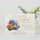 Gran concha de concha llena de flores, lirios e hidrangea azul con dólar de arena y pez estrella. Elegante invitación a bodas temáticas de playa.