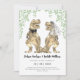 Deleite a sus invitados con esta divertida invitación de boda con tema de dinosaurios con divertidos novios T-Rex. Fácil de personalizar con los nombres de los novios, la fecha de la boda y todos los detalles del lugar de la boda en tipografía moderna. Divertidas ilustraciones de novios T-Rex en tonos marrones con follaje de la selva en tonos verdes. Arte de dino original único de la artista Catherine Sweetman