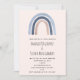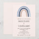 Una invitación de boda con un arcoíris lindo y caprichoso. Colores azul y melocotón.