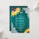 Elegante invitación a la boda verde azulada y girasol con girasoles en el fondo de un granero adornado con encaje floral blanco y luces de cuerda. Diseño de tarjetas perfecto para invitar a sus huéspedes a su verde azulado rústico campo, patio trasero o fiesta de bodas de granero inspirada en flores de girasol.