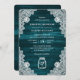 Invitación rústica a la boda verde azulada con un frasco de albañil sobre un fondo rústico de madera adornado con un encaje floral blanco. Personalice fácilmente esta invitación verde azulada a la boda para complementar su rústico país, o fiesta de bodas de granero.