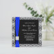 Invitación de boda cuadrada azul marino negro con superposición de encaje gris plateado y lazo de corte negro azul real diamante.