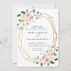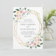 Elegantes invitaciones de boda florales con detalles bodas rodeados por un falso marco geométrico de Relieve metalizado dorado adornado con ramos de flores de color rosa, púrpura y blanca (peonías y rosas) y exuberantes hojas de eucalipto verde. Las invitaciones femeninas a la boda floral se revierten a un fondo rosa claro y ruidoso.