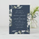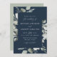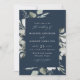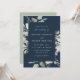 Elegantes invitaciones de boda eucalipto con detalles enmarcados por un borde de eucalipto y follaje en tonos verde claro y sabio oscuro con un fondo azul marino. La boda eucaliptus acuarela invita a revertir para mostrar un fondo verde sabio sólido.