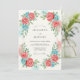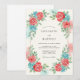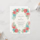 Un delicado diseño de acuarela presenta rosas coralinas entrelazadas con suaves flores azules y hojas verdes exuberantes. El estilo aéreo y pictórico evoca una atmósfera romántica y caprichosa, perfecta para una ocasión de primavera o verano.