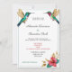 Un diseño de bodas animado y elegante con dos colibríes coloridos en vuelo, acompañados de una flor tropical roja vibrante y follaje dorado. Un diseño perfecto para bodas tropicales, de verano o de destino.