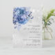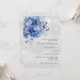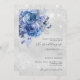 Fondo de color plateado falso decorado con flores azules y chispas purpurinas falsas. Personalice y agregue sus nombres y detalles del boda. Letras de color negro.